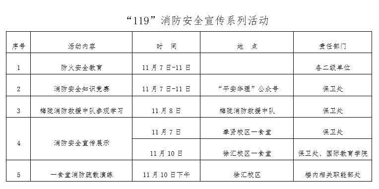 根據《華東理工大學關于開展今冬明春防火安全活動的通知》(校保〔2022〕3號)安排,學校將以2022年“119”消防安全宣傳周為契機,拉開冬春季節防火安全活動的序幕。通過開展系列活動,繼續加強師生消防安全教育,持續提升師生火災自救互救能力,全面維護在校師生員工生命財產安全,全力確保學校不發生火災事故。
