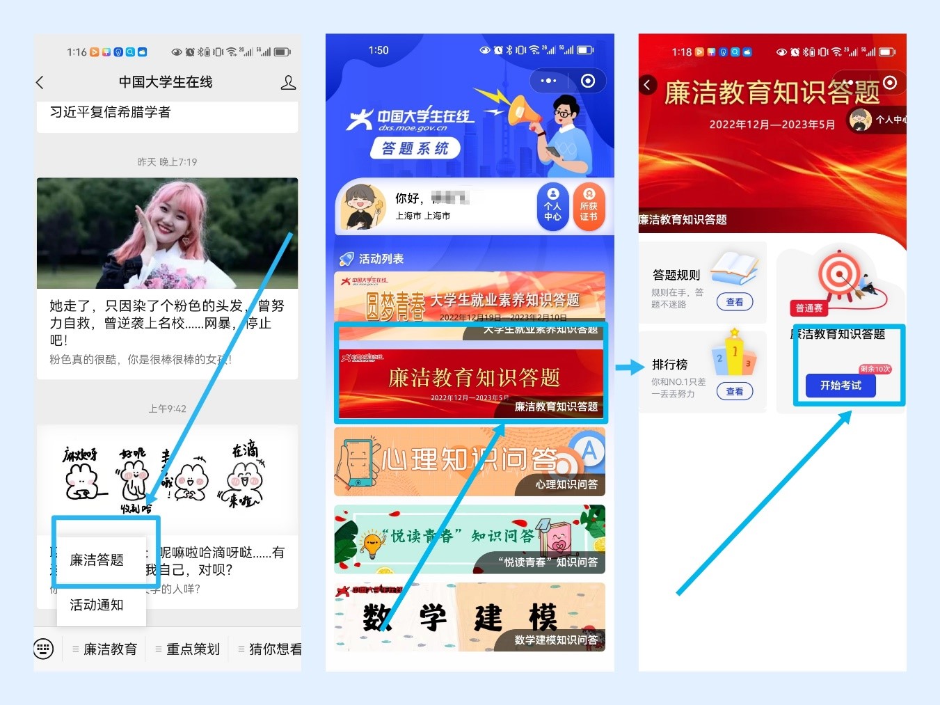 具體請關注“中國大學生在線”微信公眾號,點擊菜單欄“廉潔教育”參與答題,或登錄中國大學生在線活動平臺參與答題。