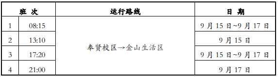 教職工班車9月14日(周六)按照工作日正常運(yùn)行,9月15日-9月17日期間按照下表運(yùn)行:
