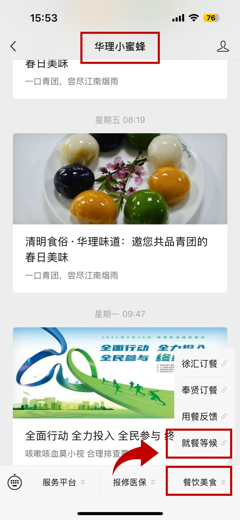進入【華理小蜜蜂】公眾號→菜單欄選擇【餐飲美食】→點擊【就餐等候】進入系統