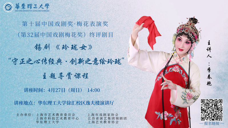在上海市藝術教育委員會、上海市科技藝術教育中心、上海市藝術教育協會的支持下,江蘇省演藝集團錫劇團經典劇目《玲瓏女》主題導賞課即將來到華東理工大學徐匯校區,屆時本劇主演、一級演員、中國戲劇家協會會員季春艷老師將帶來以“守正之心傳經典·創新之意繪玲瓏”為主題的講座,敬請廣大師生關注。