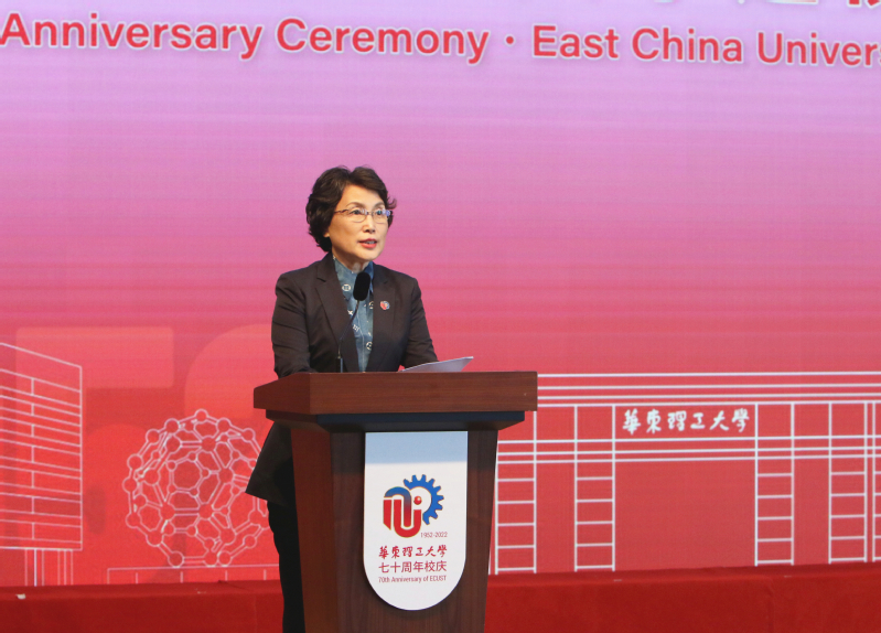 校黨委書記杜慧芳代表學校表示,建校70年來,在教育部領導下,在上海市支持下,學校各項事業得到長足進步,衷心感謝各級領導的親切關懷。在慶祝建校70周年之際,深切緬懷首任校長張江樹先生等先賢前輩和名譽校長成思危校友,衷心感謝為學校70年發展辛勤耕耘的教職員工、愛國榮校的華理學子、心系母校的海內外校友,以及所有關心、支持華東理工大學事業發展的社會各界和朋友們。她表示,黨的二十大繪就了中國式現代化的宏偉藍圖,華東理工大學將堅持以習近平新時代中國特色社會主義思想為指導,認真學習宣傳貫徹黨的二十大精神,全面貫徹黨的教育方針,努力培養德智體美勞全面發展的社會主義建設者和接班人。
