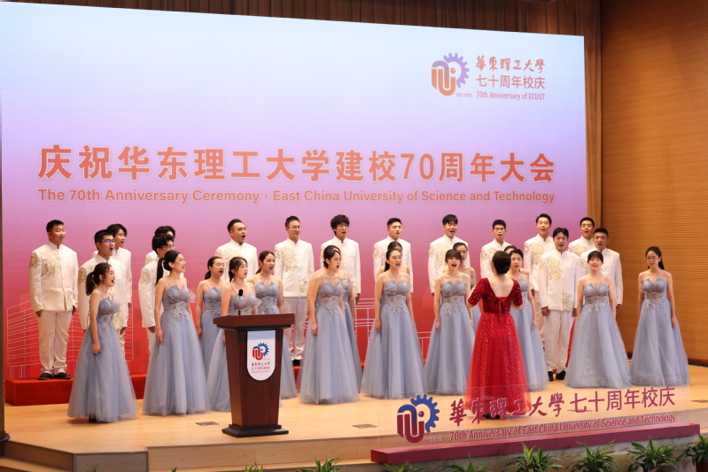 最后,華東理工大學學生合唱團用歌聲獻禮70周年校慶,傾情演唱歌曲《領航》,溫暖的歌詞,鏗鏘的旋律,傳遞出真摯的愛黨愛國之情。全場合唱華東理工大學校歌《明天的希望》,慶祝大會圓滿結束。