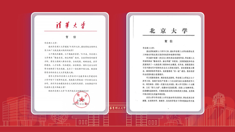 北京大學、清華大學等兄弟院校,以及中共昆明市委、中國化工學會等單位,以賀信、賀電等方式發來祝賀,海外合作高校代表發來祝賀視頻,共同為華東理工大學70華誕獻上美好的祝愿。