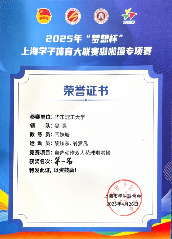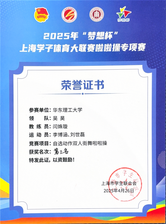 近日,由共青團上海市委員會、上海市教育委員會、上海市體育局指導的“夢想杯”上海學子體育大聯賽啦啦操專項賽在華東師范大學閔行校區體育與健康學院籃球館舉行。本次“夢想杯”上海學子體育大聯賽設有花球啦啦操、爵士啦啦操和街舞啦啦操三大賽事項目,來自全市41所高校的近700名選手熱情參與。經過激烈角逐,我校代表隊在雙人花球啦啦操項目中取得第一名,在雙人街舞啦啦操項目中取得第三名,我校也在此次專項賽中獲團體第六名和優秀組織獎。