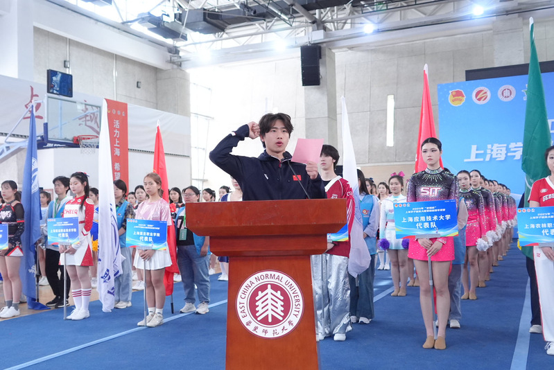 開幕式上,我校黎炫東同學作為運動員代表宣誓,上海市健美操協會副秘書長、華東師范大學熊德良老師代表全體裁判員進行宣誓。