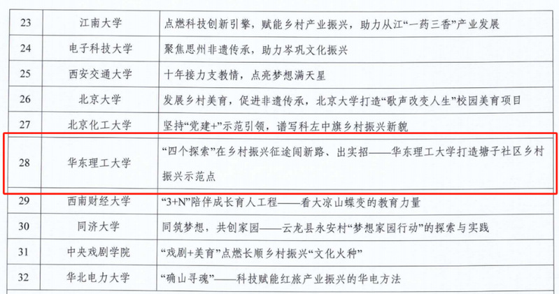 近日,第八屆教育部直屬高校精準幫扶典型項目推選結果公布,我校申報的“‘四個探索’在鄉村振興征途闖新路、出實招——華東理工大學打造塘子社區鄉村振興示范點”獲評精準幫扶典型項目。這是學校繼2021年獲評教育部首批服務鄉村振興創新試驗項目后,在精準幫扶項目領域取得的新突破。