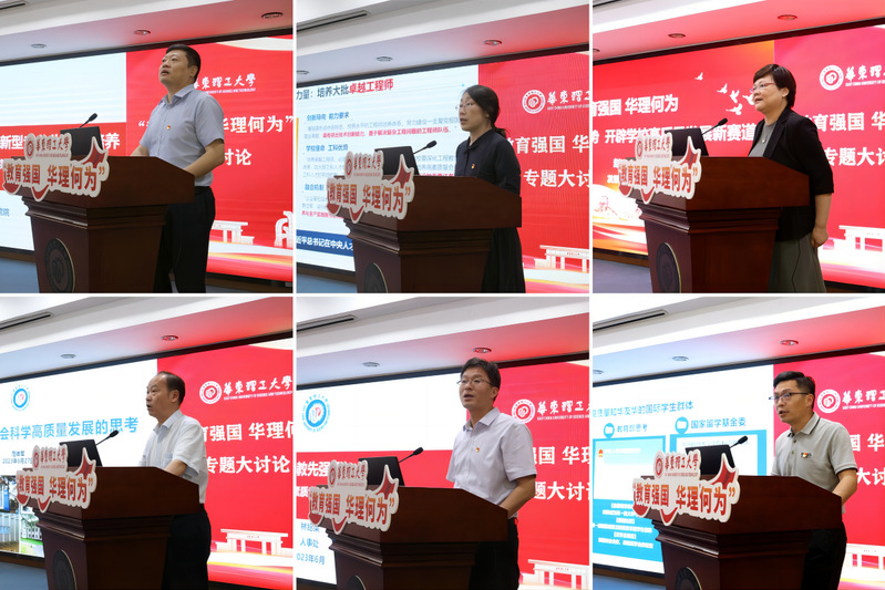 在“教育強(qiáng)國(guó) 華理何為”專(zhuān)題大討論中,科學(xué)技術(shù)發(fā)展研究院院長(zhǎng)趙黎明,研究生院院長(zhǎng)、卓越工程師學(xué)院常務(wù)副院長(zhǎng)杜文莉,發(fā)展規(guī)劃處處長(zhǎng)趙玲,人文社會(huì)科學(xué)處處長(zhǎng)范體軍,人事處處長(zhǎng)林紹梁,國(guó)際教育學(xué)院院長(zhǎng)李霄鵬,分別圍繞“以特色化有組織科研支撐創(chuàng)新型專(zhuān)業(yè)化人才培養(yǎng)”“黨建引領(lǐng) 協(xié)同一體 培養(yǎng)創(chuàng)新型卓越工程人才探索”“發(fā)揮學(xué)科特色優(yōu)勢(shì),開(kāi)辟學(xué)校高質(zhì)量發(fā)展新賽道”“關(guān)于學(xué)校哲學(xué)社會(huì)科學(xué)高質(zhì)量發(fā)展的思考”“強(qiáng)教先強(qiáng)師——加速建設(shè)高素質(zhì)專(zhuān)業(yè)化創(chuàng)新型教師隊(duì)伍”“教育強(qiáng)國(guó) 華理何為——來(lái)華留學(xué)高質(zhì)量?jī)?nèi)涵式發(fā)展規(guī)劃”等主題,作了交流發(fā)言。大家表示,要堅(jiān)持不懈用習(xí)近平新時(shí)代中國(guó)特色社會(huì)主義思想凝心鑄魂,始終將廣大師生的需求和利益作為一切工作的出發(fā)點(diǎn)和落腳點(diǎn),主動(dòng)超前布局、有力應(yīng)對(duì)變局、奮力開(kāi)拓新局,以實(shí)際行動(dòng)書(shū)寫(xiě)好“強(qiáng)國(guó)建設(shè),教育何為”“教育強(qiáng)國(guó),華理何為”的生動(dòng)答卷。