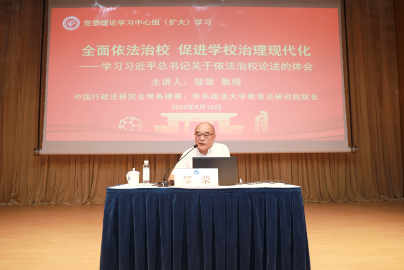 在學(xué)校黨委理論學(xué)習(xí)中心組(擴(kuò)大)學(xué)習(xí)會上,專題學(xué)習(xí)了習(xí)近平法治思想,邀請了中國行政法研究會常務(wù)理事、華東政法大學(xué)教育法研究院院長鄒榮教授作題為“全面依法治校 促進(jìn)學(xué)校治理現(xiàn)代化——學(xué)習(xí)習(xí)近平總書記關(guān)于依法治校論述的體會”的輔導(dǎo)報(bào)告。報(bào)告聚焦習(xí)近平法治思想的精神實(shí)質(zhì)和核心要義,圍繞習(xí)近平總書記關(guān)于依法治校的重要論述、依法治校的基本要求、依法治校的主要環(huán)節(jié)等三個方面進(jìn)行了深入闡述,并著重介紹了依法治校的重點(diǎn)環(huán)節(jié)在于依法管理學(xué)生事務(wù)、依法管理學(xué)位事務(wù)、依法管理教師事務(wù)、依法維護(hù)學(xué)校權(quán)益。
