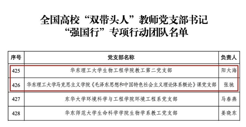 近日,教育部辦公廳公布了全國高校“雙帶頭人”教師黨支部書記“強國行”專項行動(以下簡稱“強國行”專項行動)團隊名單,我校生物工程學院教工第二黨支部和馬克思主義學院《毛澤東思想和中國特色社會主義理論體系概論》課黨支部成功入選。