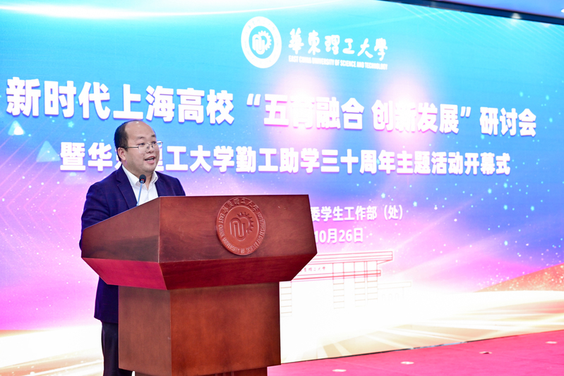 三十載勤工助學路,歲月如歌續新章。恰逢華東理工大學72周年校慶,學校勤工助學工作也迎來了30周年。10月26日,學校在奉賢校區隆重舉行新時代上海高校“五育融合 創新發展”研討會暨華東理工大學勤工助學三十周年主題活動開幕式。校黨委副書記宋來、沈海濤,上海泰坦科技股份有限公司董事長兼首席執行官、全國五一勞動獎章獲得者謝應波,貴州省人大代表、首屆全國高校畢業生基層就業卓越獎獲得者吳國邦,校友代表、教師代表、勤工助學學生代表等150余人出席了開幕式。開幕式由黨委學生工作部(處)部(處)長崔姍姍主持。