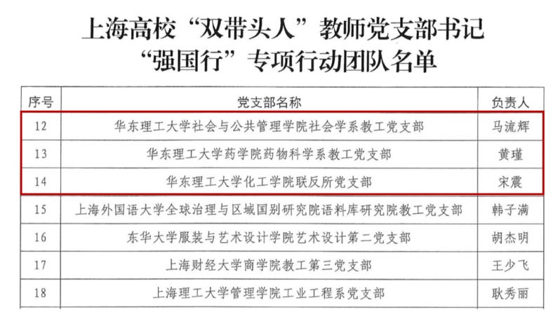 近日,上海市教衛工作黨委公布了上海高校“雙帶頭人”教師黨支部書記“強國行”專項行動(以下簡稱“強國行”專項行動)團隊名單,評選出42個上海高校“雙帶頭人”教師黨支部書記“強國行”專項行動團隊,我校社會與公共管理學院社會學系教工黨支部、藥學院藥物科學系教工黨支部、化工學院聯反所黨支部3個成功入選。