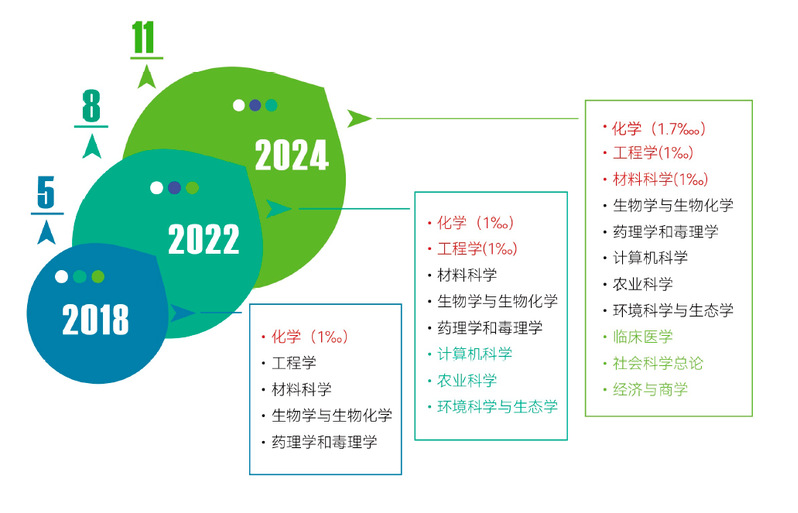 3個學科再次入選一流學科建設名單,5個學科在第五輪學科評估和全國專業學位水平評估中獲評A類學科,11個學科進入ESI全球前百分之一、3個學科進入ESI全球前千分之一、1個學科進入ESI全球前萬分之二……自第十一次黨代會以來,華東理工大學有效落實加快推進中國特色、世界一流大學和優勢學科建設的部署要求,圍繞國家戰略需求,以一流學科建設為核心,以學科集群化發展為思路,聚焦優勢學科,優化布局結構,創新學科建設機制,建成高峰凸顯、高原林立、特色鮮明的學科發展體系。